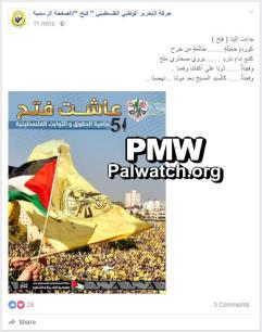 Fatah poster in honor of its 51st anniversary: The "1" forms the shape of Palestine replacing Israel