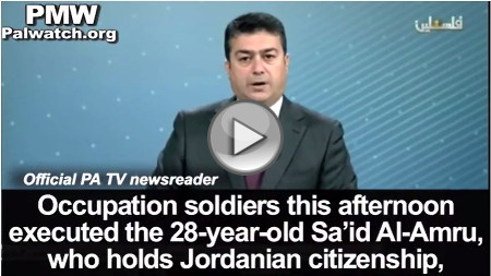 Official PA TV newsreader: "In occupied Jerusalem, Occupation soldiers this afternoon executed the 28-year-old Sa'id Al-Amru, who holds Jordanian citizenship, in the area of the Damascus Gate [in Jerusalem] under the pretext that he tried to carry out a stabbing operation...