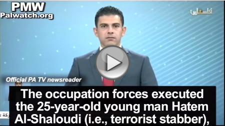 Official PA TV newsreader: "The occupation forces executed the 25-year-old young man Hatem Al-Shaloudi (i.e., terrorist stabber), by shooting him with automatic weapons in the Tel Rumeida area in the center of Hebron, under the pretext that he had stabbed a soldier, lightly injuring him."