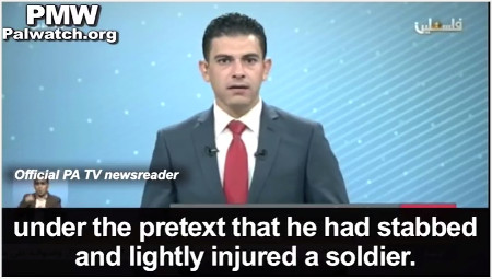 As with the other stabber, PA TV claimed Israel had "executed" terrorist Hatem Al-Shaloudi "under the pretext that he had stabbed a soldier":