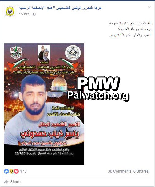 Yasser Dhiab Hamdouni - serving a life sentence for participating in the murder of Israeli citizen Avner Maimon in the Palestinian town of Ya'abad in the West Bank (June, 12, 2003). Hamdouni, a member of the Al-Aqsa Martyrs’ Brigades (Fatah’s military wing), died on Sept. 25, 2016, after collapsing while exercising in the Israeli Rimon Prison yard.