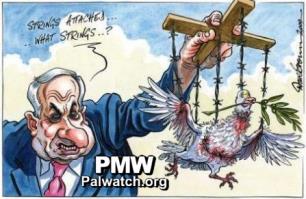 The cartoon shows a large-nosed Israeli Prime Minister Benjamin Netanyahu holding a bleeding dove with an olive branch in its beak dangling on barbed wire, like a marionette on strings, while Netanyahu says in English: “Strings attached…what strings…?”