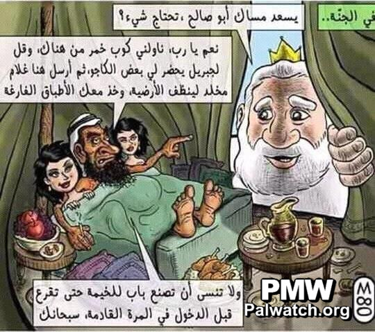 The cartoon in question depicts a conversation between God and a bearded Muslim lying in bed with two women. The upper right-hand caption reads: “In Paradise…”
