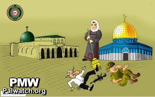 In this cartoon, a Palestinian woman is sweeping an Israeli soldier and a religious Jew off the Temple Mount - Judaism's holiest site. In the background are the Al-Aqsa mosque and the Dome of the Rock, which were built on the Temple Mount.