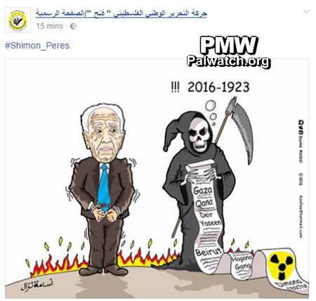 On the day after former Israeli President Shimon Peres passed away, Fatah demonized Peres as a murderer about to enter Hell. In a cartoon on Fatah's official Facebook page (shown above) Peres is shown trembling and handcuffed as the Grim Reaper shows or reads to Peres from an English language scroll the long list of "crimes" that the PA-Fatah accuse Peres of committing. In the background flames are seen, representing the fires of Hell that, according to Fatah, are awaiting Peres.