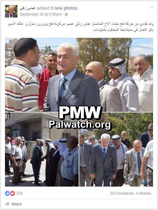 Posted Text: “A Fatah leadership delegation led by Fatah Central Committee member brother fighter Abbas Zaki visits the home and family of prisoner Bakr Al-Najjar, who was sentenced to [6] life sentences, in the city of Yatta (i.e., near Hebron).”