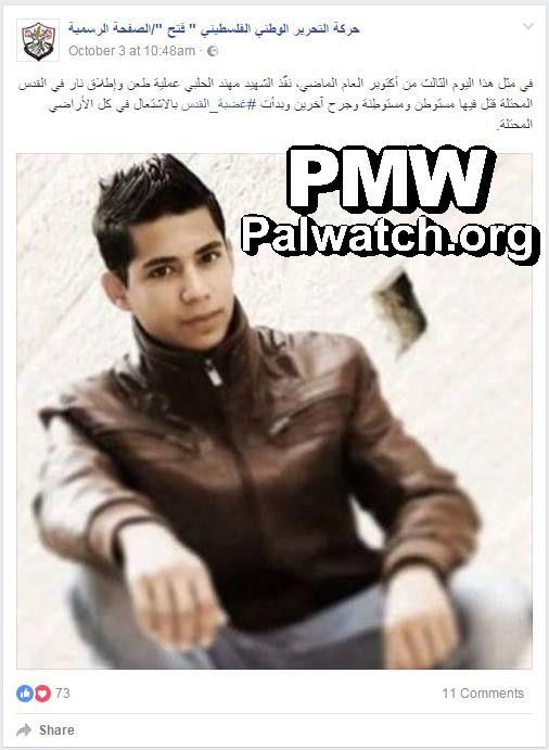 Posted text: “Today, on Oct. 3 of last year [2015], Martyr (Shahid) Muhammad Halabi carried out a stabbing and shooting operation in occupied Jerusalem, in which a male and female settler were killed (sic., the 2 murdered were both men) and others were wounded, and #The_rage_of_Jerusalem began to flare up in all of the occupied territories”