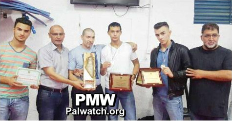 The plaque of honor awarded to the boxers, as seen in the picture, features the PA map of “Palestine” that presents all of Israel as “Palestine” together with the PA areas.