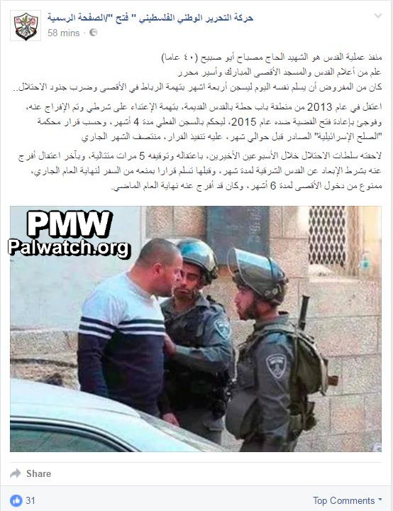 Posted text: "The one who carried out the operation (i.e., terror attack, 2 murdered) today in Jerusalem is a pilgrim [to Mecca] Martyr (Shahid) Musbah Abu Sbeih (40), one of the most prominent people in Jerusalem and the blessed Al-Aqsa Mosque and a released prisoner.