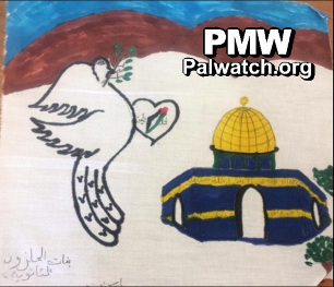 Drawing shows a dove with an olive branch in its beak next to a heart containing the PA map of “Palestine" that presents all of Israel as "Palestine" together with the PA areas, in the colors of the Palestinian flag and with the word “Palestine” written over it. Below is the Al-Aqsa Mosque.