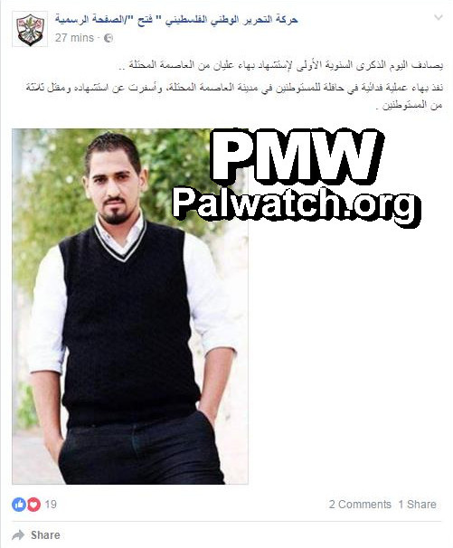 Posted text: “Today [Oct. 13, 2016] is the first anniversary of the death as a Martyr (Shahid) of Baha Alyan (i.e., terrorist, murdered 3) from the occupied capital [of Jerusalem].