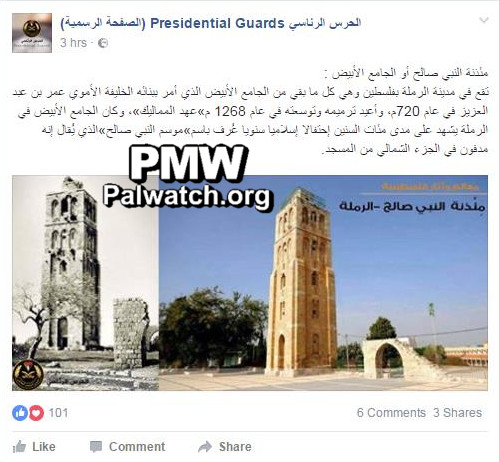 Posted text: “The Nabi Saleh Minaret, or the White Mosque, is located in the city of Ramle in Palestine (sic., Ramle is an Israeli city near the coast), and it is all that is left of the White Mosque that Umayyad Caliph Umar Bin Abd Al-Aziz ordered to build in 720, and which was renovated and expanded in 1268 during the Mamluk period.”