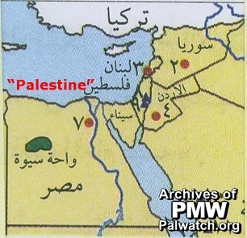 This map replaces the area of all of Israel with "Palestine" and shows the names of all the surrounding states. The State of Israel is not mentioned at all.