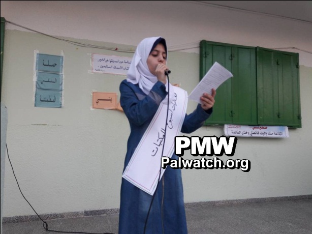 The picture shows a girl speaking at the Salah Khalaf Elementary School for Girls in Gaza.