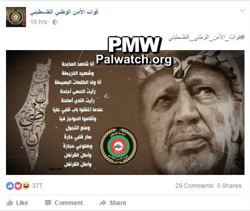 The image shows Yasser Arafat, the text of a poem by Palestinian national poet Mahmoud Darwish, and the PA map of “Palestine” that presents all of Israel as “Palestine” together with the PA areas. The word “Palestine” is written on the map. The logo of the PA National Security Forces appears at the bottom center of the image.