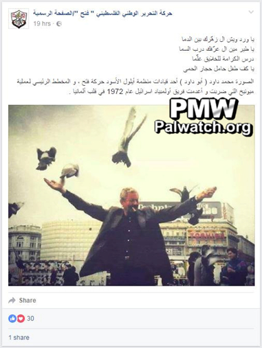 Fatah also glorified the Munich Olympics massacre this week, honoring Muhammad Daoud Oudeh, another of the planners of the terror attack, boasting that they "executed" the Israeli athletes "in the heart of Germany":Posted text: "Picture of Muhammad Daoud 'Abu Daoud,' one of the leaders of Fatah's Black September organization and the main planner of the Munich operation that executed the Israeli Olympic delegation in 1972 in the heart of Germany."