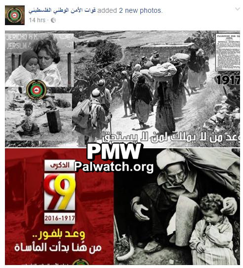 Palestinian Authority National Security Forces Facebook: Balfour Declaration was “promise by one who has no ownership to one who has no right”