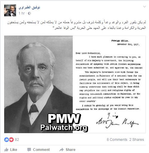Text and image posted on the Facebook page of Fatah Central Committee member Tawfiq Tirawi. The image shows former British Foreign Secretary Arthur Balfour and a copy of his letter to Baron Rothschild.