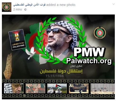 The image shows a picture of Yasser Arafat surrounded by olive branches with the PA National Security Forces logo to his right, and to his left a dove and the PA map of “Palestine" that presents all of Israel as "Palestine" together with the PA areas in the colors of the Palestinian flag.