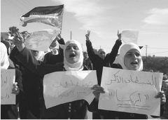 A procession of women and children march in Nazareth to show solidarity with Gaza. On the sign on the left:"America - The Big Satan."