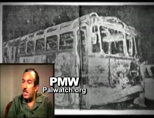 The second screenshot shows the burnt out bus from the Coastal Road Massacre, the most lethal terror attack in Israel’s history in which 37 civilians were murdered, 12 of them children. Abu Jihad’s picture is seen in the corner.