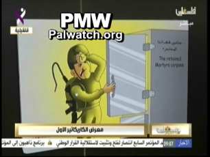 One of the cartoons from the exhibit is shown on-screen. The cartoon shows an Israeli soldier with a Star of David on his helmet and a grotesquely large nose opening a morgue refrigerator and being blinded by light emanating from within.