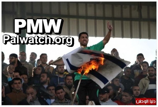 The picture shows a Palestinian spectator burning an Israeli flag in the bleachers at a game in Rafah in the Gaza Strip.
