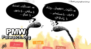 Cartoon criticizes bickering on Arab social media over using terms “Israel” or “the Zionist entity” in celebrating Palestinian arson wave, while Arab world burns in background
