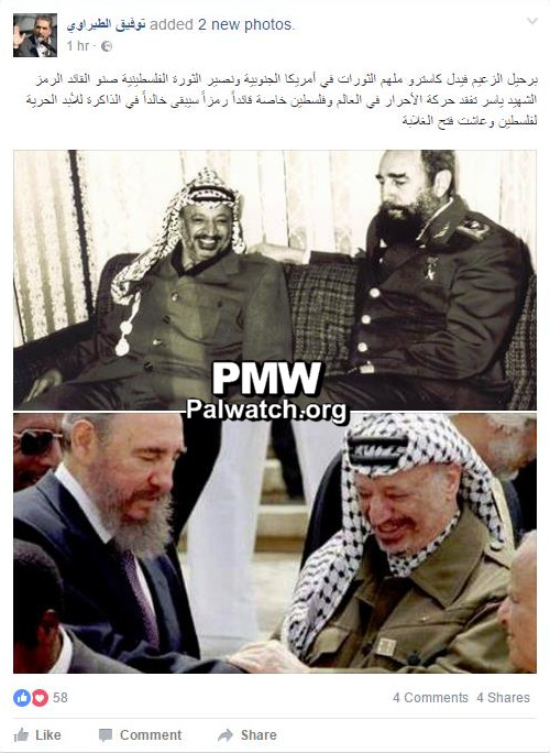 Posted text: “With the death of leader Fidel Castro, the source of inspiration for the revolutions in South America, defender of the Palestinian revolution, and the double of symbol Martyr (Shahid) Yasser [Arafat], the movement of free people in the world, and in Palestine in particular, have lost a leader and symbol who will remain in memory forever. Freedom to Palestine and long live victorious Fatah”