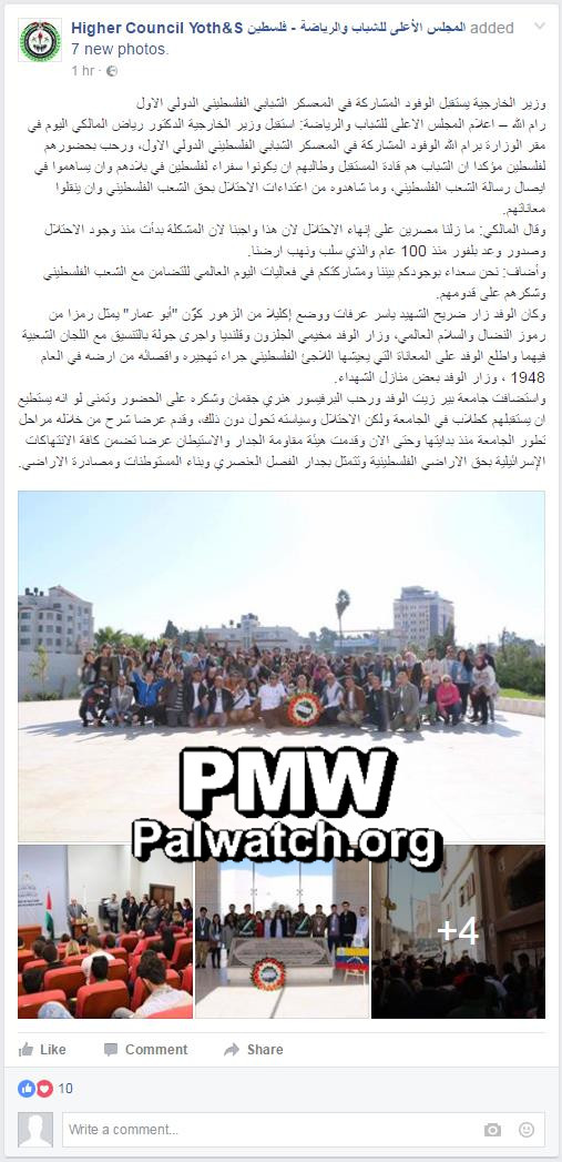 Posted text: “The [PA] Minister of Foreign Affairs [Riyad Al-Malki] welcomed the delegations participating in the First International Palestinian Youth Camp