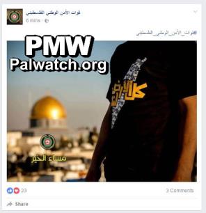 Posted text: “#The_Palestinian[_PA]_National_Security_Forces” The image shows someone wearing a shirt with the PA map of “Palestine" that presents all of Israel as "Palestine" together with the PA areas, with the Dome of the Rock seen in the background. The PA National Security Forces logo appears at the bottom left side of the image.