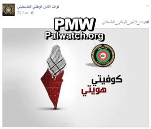 The image shows the PA map of “Palestine” that presents all of Israel as “Palestine” together with the PA areas wrapped in a keffiyeh (Arab headdress), alongside the PA National Security Forces logo.