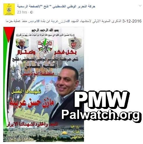 Posted text: “Dec. 3, 2016 – the first anniversary of the death as a Martyr (Shahid) of Mazen Ariba from the town of Abu Dis, the one who carried out the Hizme operation (i.e., terror attack, 2 injured)”