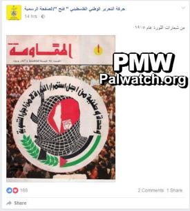The image shows the cover of a magazine, The Resistance, with a Fatah logo shown against a background of a crowd of people. The logo shows a head wrapped in a keffiyeh (Arab headdress), with a raised fist and the PA map of "Palestine" that includes the PA areas as well as all of Israel against a red background, in place of a face. Behind the head is a rifle.