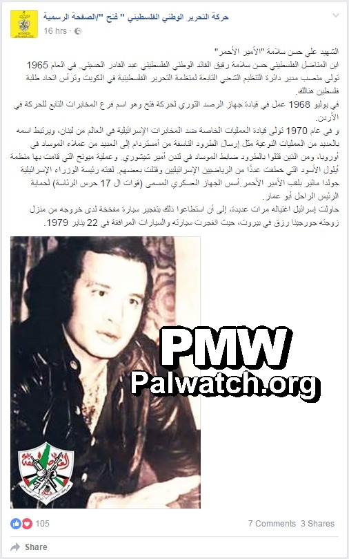 Fatah Facebook glorifies terrorist leader “the Red Prince,” who carried out “quality operations” such as Munich Olympics Massacre