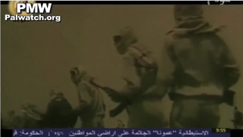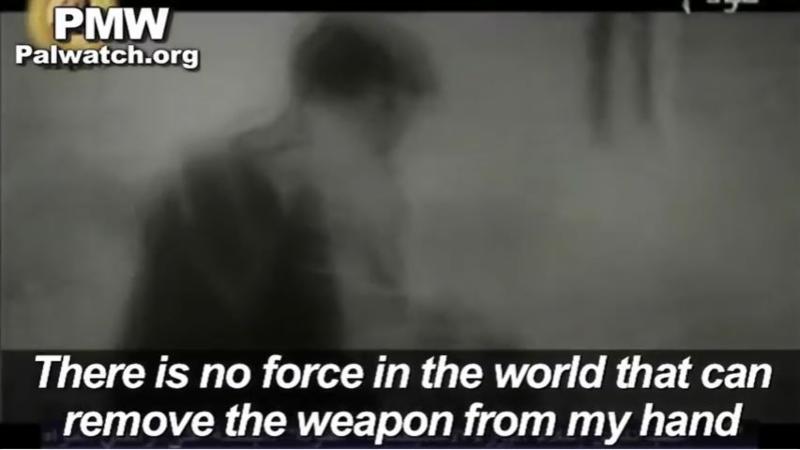 The visuals are from old black-and-white films of Fatah terrorists in training. Former PA Chairman Yasser Arafat is shown handing out rifles and making a declaration supporting armed terror: