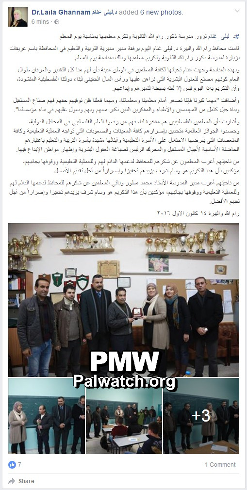 “#[District_Governor_of_Ramallah_and_El-Bireh_]Laila_Ghannam visits Ramallah High School for Boys and honors its teachers for Teachers’ Day.”