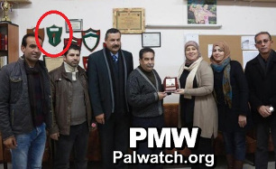 In the image a green plaque of honor can be seen on the wall in the background (second plaque from the left), and on it appears the Palestinian flag in the shape of the PA map of “Palestine” that presents all of Israel as “Palestine” together with the PA areas.