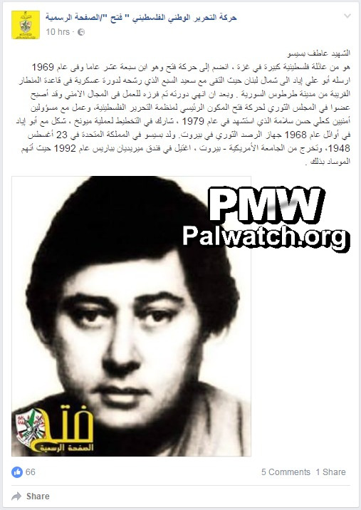 "Martyr (Shahid) Atef Bseiso (i.e., terrorist, involved in planning of Munich Massacre, 11 murdered)