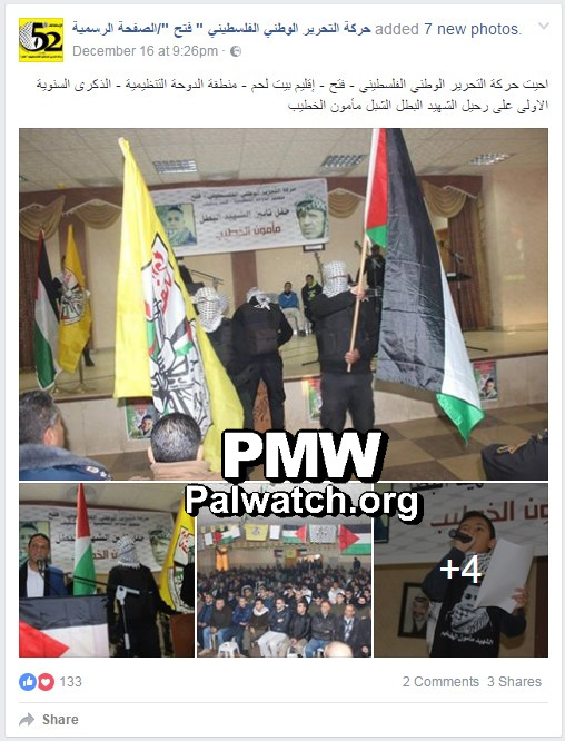 Posted text: “The Al-Doha organizational branch of the Fatah Movement’s Bethlehem branch marked the first anniversary of the death as a Martyr (Shahid) of Mamoun Al-Khatib.”