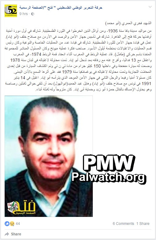 Posted text: "Martyr (Shahid) Fakhri Al-Omari 'Abu Muhammad' was born in Jaffa in 1936. [He was] among the first to join the Palestinian revolution. He participated in the first security session that the Fatah Movement sent to Cairo. He participated in the establishment of the Security and Surveillance force in Jordan together with Salah Khalaf 'Abu Iyad.' He was part of the leadership of the security force of the Palestinian revolution. He participated in leading of some of the special and quality operations (i.e., terror attacks), and was the head of the Black September organization’s department of operations and assassinations. He came up with the idea for the Munich operation (i.e., terror attack, 11 murdered), and under the false name 'Talal' he was directly responsible for the squad that carried it out."