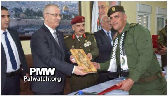 An article in Al-Quds includes a picture of PA Prime Minister Rami Hamdallah at the graduation ceremony of the first class of the Palestinian Officers Academy in Jericho. Hamdallah is seen presenting a plaque of honor featuring the PA map of “Palestine” that presents all of Israel as “Palestine” together with the PA areas.