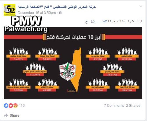 On two consecutive days this month, Fatah celebrated on its Facebook page 10 different "most outstanding" terror attacks - in total 20 attacks that killed 78 adult civilians, 16 soldiers, and 22 children. In the first post, Fatah celebrated "the 10 most outstanding operations" of all times - 10 terror attacks from Fatah's 52 years of existence. In the second post, Fatah took pride in its "10 most outstanding operations in the Al-Aqsa Intifada," - attacks the organization carried out during the PA terror campaign from 2000-2005 (the second Intifada). Some of the attacks were "outstanding" because of the numbers killed, like the bus hijacking that left 37 murdered. Others were "outstanding" even though they failed because they were milestones in Fatah history, such as Fatah's first terrorist attack which targeted the Israeli National Water Carrier ("The Eilabun operation"), and its first attack on civilians ("Kfar Hess operation").