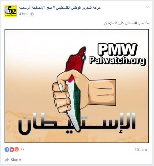 Fatah posts image of map of “Palestine,” erasing Israel, used as a knife to stab “the settlement”