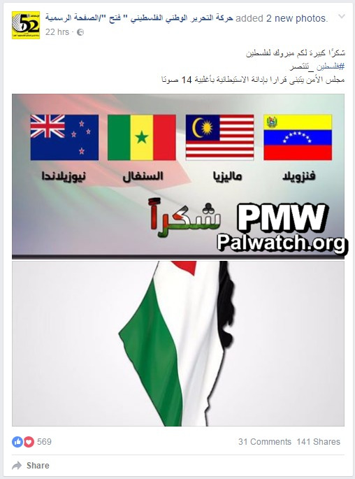 Fatah thanks countries who voted against Israel at UNSC with map of Palestine erasing Israel