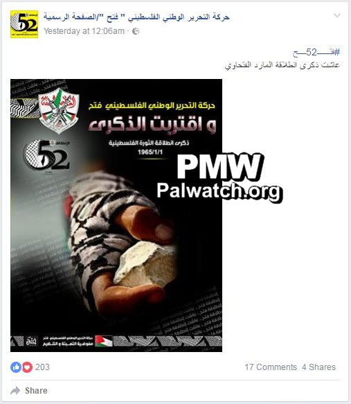 The image shows a hand wrapped in a keffiyeh (Arab headdress) holding a rock. The Fatah logo featuring a grenade, crossed rifles, and the PA map of “Palestine” that presents all of Israel as “Palestine” together with the PA areas is seen in the upper left. Under it appears the logo of the 52nd anniversary of “the Launch” (Intilaqa) of Fatah, which likewise includes the PA map of “Palestine,” along with a keffiyeh, and the Fatah logo.