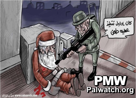 Palestinian Authority daily cartoon: Israel shoots Santa, claims he was trying to carry out a stabbing attack