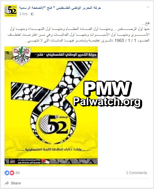 In the middle of the image appears the logo of the 52nd anniversary of “the Launch” (Intilaqa) of Fatah, which features the PA map of “Palestine,” a keffiyeh (Arab headdress), and the Fatah logo.
