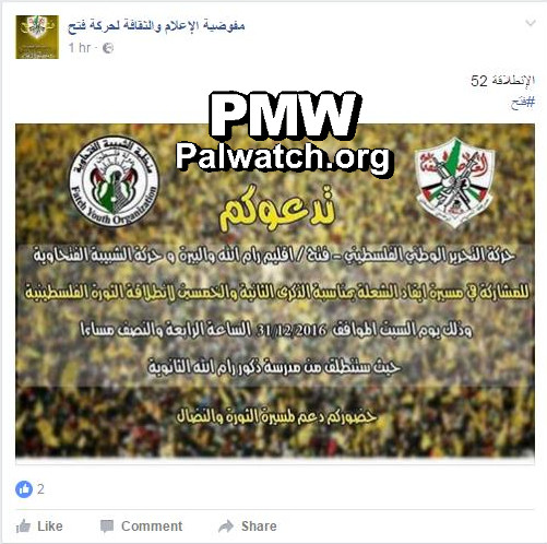 The image is an invitation from Fatah and Fatah’s Shabiba youth movement to an event in Ramallah for the 52nd anniversary of the Intilaqa, i.e., the “launch” of Fatah on Jan. 1, 1965, when it carried out its first terror attack against Israel, attempting to blow up Israel's National Water Carrier.