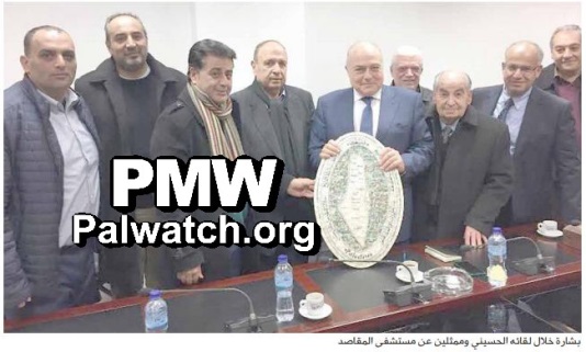 The article includes a picture with the following caption: "[PA Minister of Finance and Planning Shukri] Bishara during his meeting with [PA Jerusalem District Governor and Minister of Jerusalem Affairs Adnan] Al-Husseini and representatives of the Al-Makassed Hospital"
